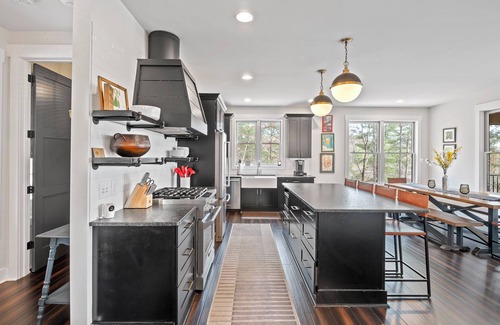 • Impressive and well-equipped kitchen with eat-in dining for 8 and island seating for 4, gas range, dishwasher, and Keurig coffee maker.